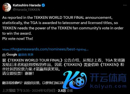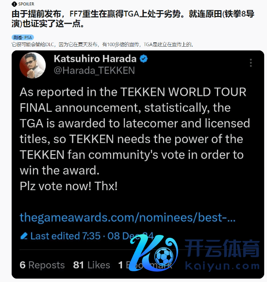 近日,格斗游戏《铁拳8》的主创原田胜弘在推特发文示意,从统计数据来看,TGA的奖项更倾向于颁发给较晚发布的游戏和授权作品,因此《铁拳》需要借助粉丝们的力量才能赢得该奖项。但愿人人多多投票,谢谢!