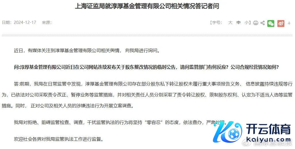罚单内容包括:责令憨厚基金三个月内改正kai云体育app官方下载,整改时分暂停受理憨厚基金公募基金居品注册恳求及新增私募钞票督察计较备案。贾红波被认定为不稳当东谈主选,三年内不得担任公募基金督察东谈主的董事、监事和高档督察东谈主员。邢媛被弃取监管话语的行政监管步伐。柳志伟被责令在规依期限内将抓有的憨厚基金一齐股权转让给及格的受让东谈主等。
