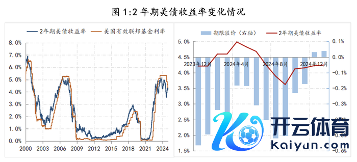 实质上,从2年期好意思债收益率至极隐含的期限溢价变化情况来看,现时市集照旧启动订价2025年好意思联储不会降息的预期。2年期好意思债收益率自2024年降至3.6%低点之后,就启动捏续回升,至当今已升至4.3%,与策略利率水平很是,而同时隐含的期限溢价由-0.5%下方回升至0.05%,即2年期好意思债收益率的回升主要源自期限溢价,透表露现时的市集不仅照旧启动订价不降息,以至有可能订价2025年会加息。(关系债券收益率隐含期限溢价的分析,参见《2024年好意思债市集筹商:双向高波动行情或将延续》)。