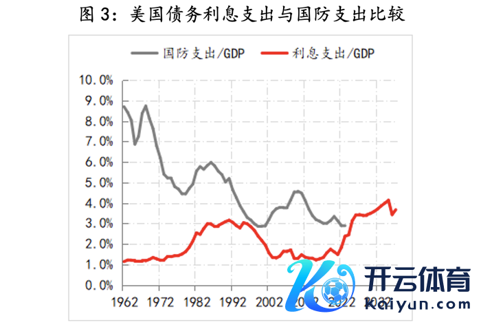 一是当今好意思国联邦政府债务余额已向上36万亿好意思元,相同意担的利息支拨界限已接近好意思国国防支拨。按照白宫预算办公室的预测,2025年好意思国联邦政府的利息支拨占GDP比重将冲突3%,冲突1万亿好意思元,向上国防支拨占比,若好意思债收益率进一步上行的话,实质利息支拨压力会更大。